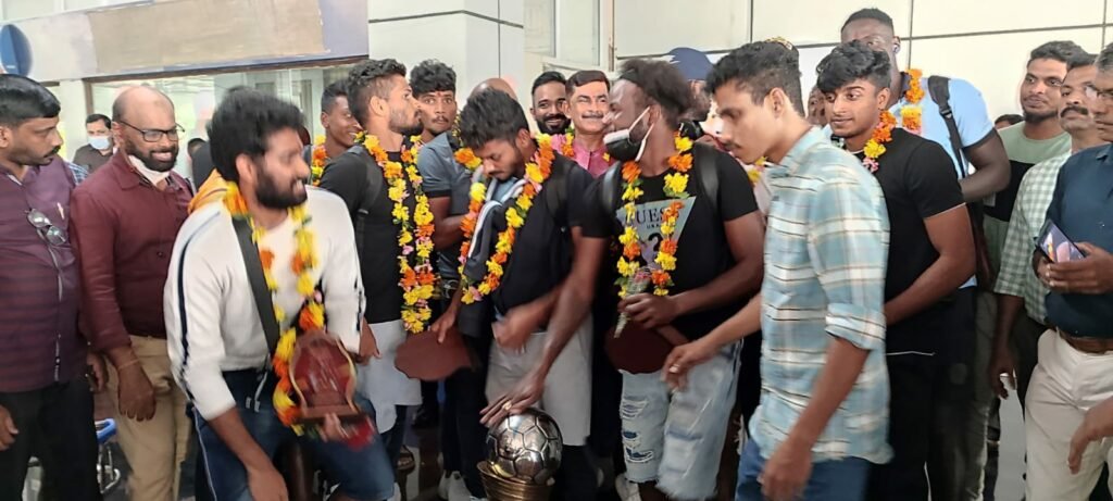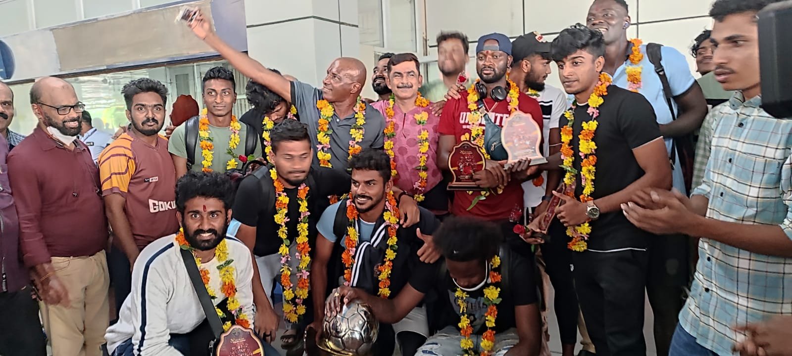ബംഗളുരു വഴി വ്യാഴാഴ്ച രാവിലെ കോഴിക്കോട് വിമാനത്താവളത്തിൽ എത്തിയ ഗോകുലം കേരള എഫ്സി ടീമിന് ഗംഭീര സ്വീകരണമാണ് നൽകിയത്. മുഹമ്മദൻസ് എഫ്സിയെ ഒന്നിനെതിരെ 2 ഗോളുകൾക്ക് പരാജയ പ്പെടുത്തിയാണ് ഗോകുലം ഇത്തവണ ഐ ലീഗിൽ കിരീടം ചൂടിയത്.